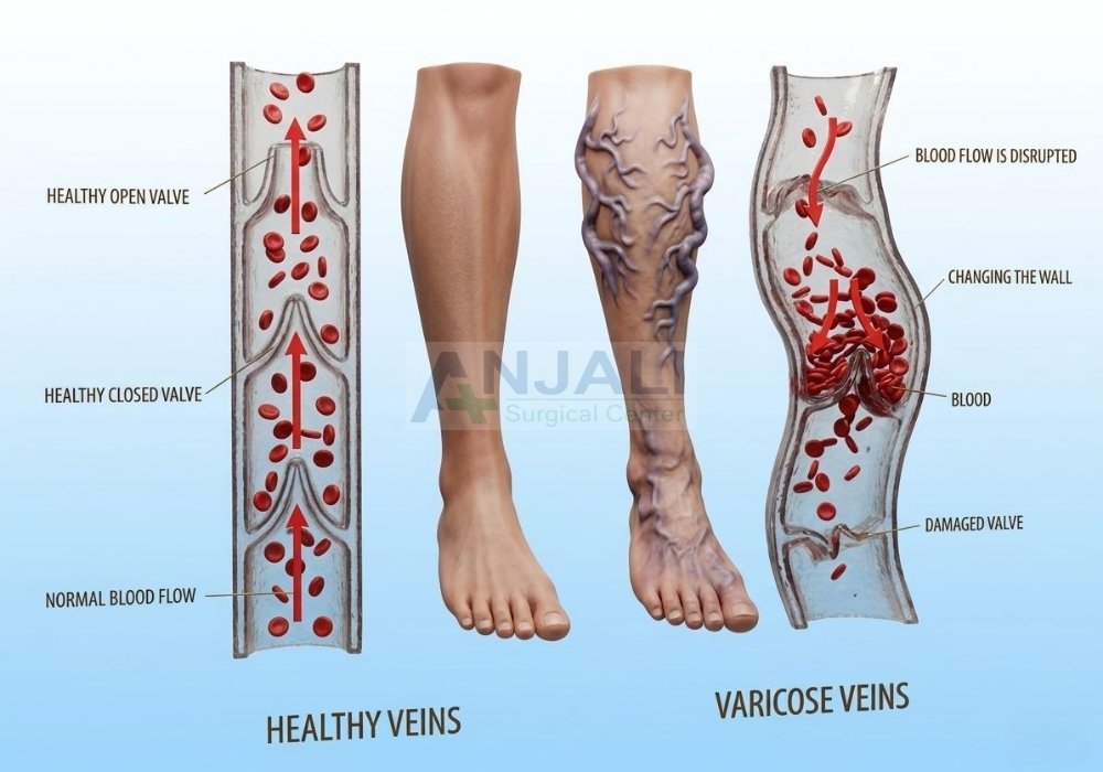 Varicose veins are enlarged, twisted, and often swollen veins that typically appear in the legs. They occur when the one-way valves in the veins, which are responsible for directing blood flow back to the heart, become weak or damaged. As a result, blood pools in the veins, causing them to enlarge and become visible through the skin.
